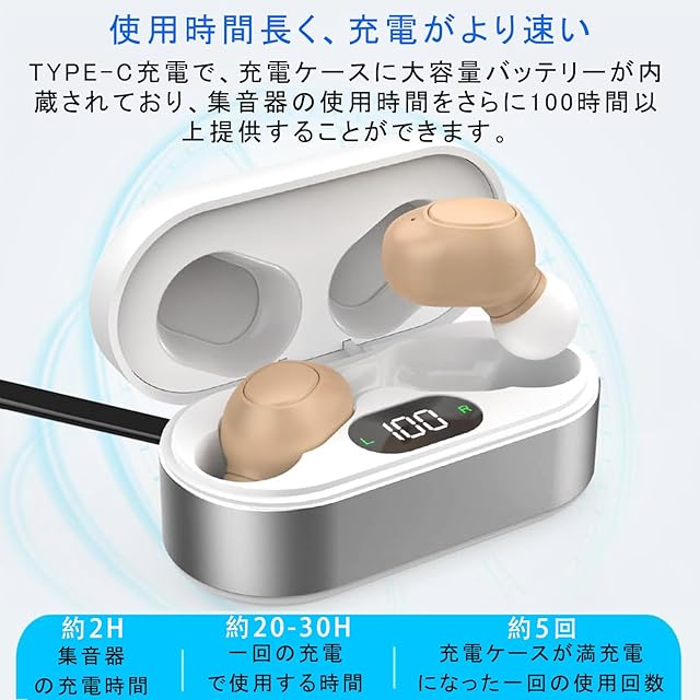 【充電式集音器】集音器を充電ケースに入れると充電が開始されます。 フル充電で最大30時間稼働可能です。充電ケースに大容量バッテリーが内蔵されており、集音器の使用時間をさらに100時間以上提供することができます。充電ケースがフル充電になった場合は、集音器を約5回充電することができます。充電ケースのバッテリー残量が十分である場合:集音器を充電ケースに入れると、集音器のオレンジ色のインジケーターライトが点灯し、自動的に電源を切って充電します。オレンジ色のインジケーターが点灯し、充電に問題がないことを確認してください。