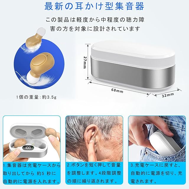 商品名:Vimaydo 集音器 しゅうおんき 高齢者集音器 音声拡聴器 両耳対応 USB充電式 耳穴式 4段階音量調節 小型 軽量 簡単操作 両親 敬老の日 母の日 父の日 高齢者プレゼント
