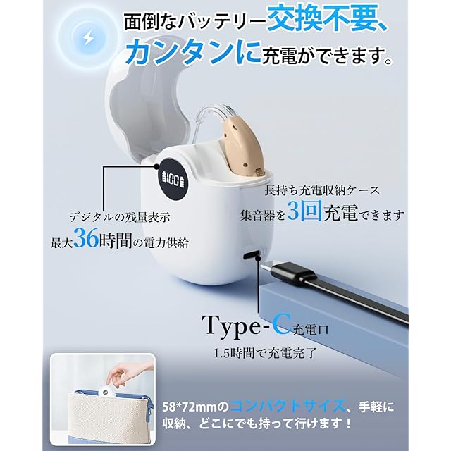 【USB充電式&収納ケース付き】 集音器はType-C充電ケーブルと専用充電ケースの2つの方法で充電できます。ケースは100分でフル充電され、充電完了後、最大三回まで集音器を充電できます。初回充電時は、絶縁シールを剥がし、10〜12時間充電してください。これにより、バッテリーの寿命を延ばすことができます。
