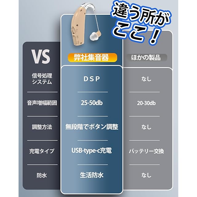 【音を30倍増幅&無段階音量調整】 DSP技術を採用することで、音を最大30倍まで増幅し、音質を向上させ、音声の明瞭さを強化するとともに、周囲の雑音を抑制します。この集音器(しゅうおんき)には物理的なボタンも搭載されており、無段階で音量調整ができ、自由に元の世界の音を取り戻せます。テレビの音声や会話、音楽鑑賞など、様々な場面で快適にご利用いただけます。ご注意:集音器は定期的に清掃することで、より良く音を聞き取ることができます。適用対象:中等度から重度の聴覚障害のある方に適していますが、ほとんど音が聞こえない方には適していません。