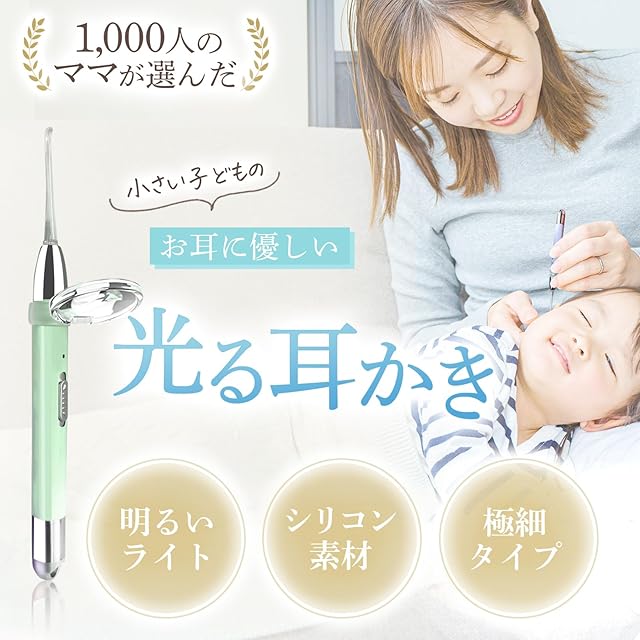 1,000人のママたちに選ばれたこの耳かきは、親子の耳掃除をもっと安心・快適にするために作られた商品です。 ・明るいライト付き 耳の奥まで見える明るいLEDライトを搭載。 暗い部分でもしっかり確認しながら耳掃除ができます。 目を凝らす必要がなく、細かい汚れも逃しません。 ・シリコン素材で安心設計 先端部分には柔らかいシリコン素材を使用。 ・極細タイプで届きやすい 小さな耳にもフィットする極細形状の先端が、耳の奥や細かな部分にもしっかり届きます。 効率よく、簡単に掃除できる設計です。 ・安全性を重視したデザイン 滑りにくい持ち手や、角が丸い形状に仕上げることで、小さな子供の耳掃除をより安全にサポートします。