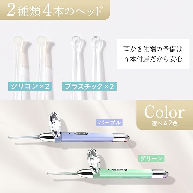 カラーはパープルとグリーンの2色からお選びいただけます。さらに専用のケースも付属しているので、持ち運びや保管時に便利です。子供や家族みんなで使えるこの耳かきで、毎日の耳ケアをもっと安心で快適なものにしてみませんか?