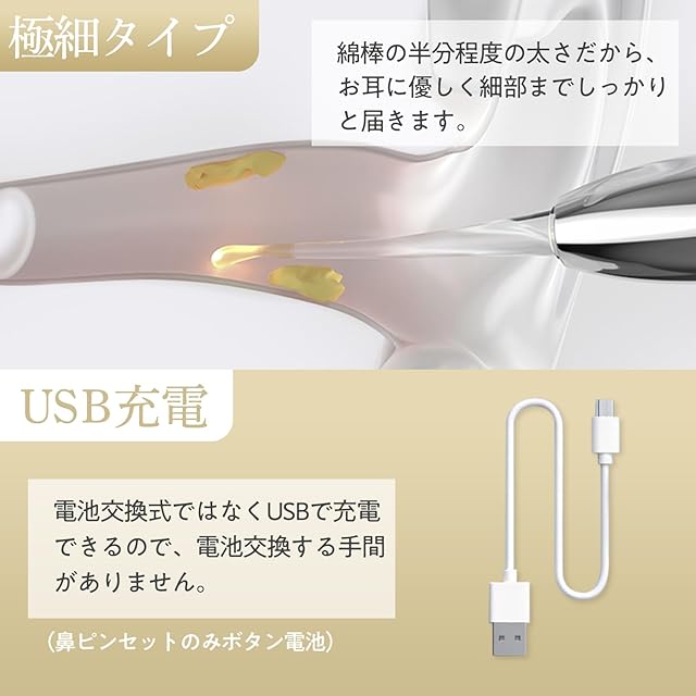 この光る耳かきは面倒な電池交換がいらないUSB充電式なので、忙しい時にも手軽に準備ができます。 先端は極細で柔らかく作られているので、デリケートな耳の奥までやさしく届きます。 小さなお子さまが嫌がる心配も少なく、ママにとって頼もしいアイテムです。