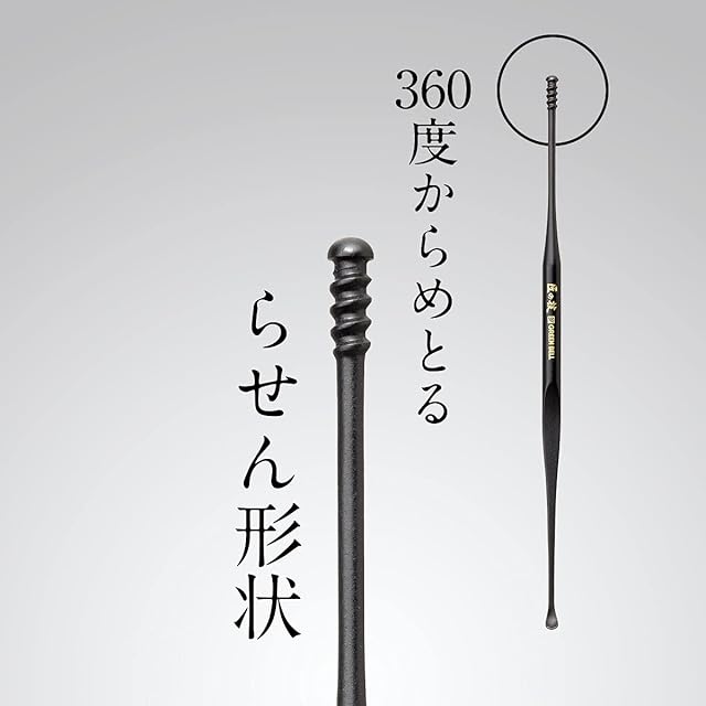 360度からめとるらせん形式と、しなってすくいやすい皿形状のツーウェイタイプです。 衝撃に強く、皿部が折れたり割れることのないチタン製。 フッ素樹脂加工だから滑らすゴッソリ取れ、取れた耳垢がよく見えます。