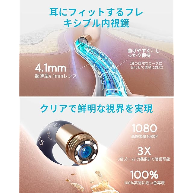 【フレキシブルレンズチューブ&1000万画素高精細耳かき カメラ付き】このカメラ付き耳かきは、2024年最新技術のフレキシブルレンズチューブを搭載。狭くて曲がった耳道でもスムーズに使用でき、耳道を傷つける心配がありません。一般的な耳道の幅は約6~7mmで、お子様でも安心して使えます。さらに、1000万画素の高精細カメラと高輝度LEDライトを備えており、暗く狭い耳道も鮮明に映し出し、安全で効果的な耳掃除をサポートします。