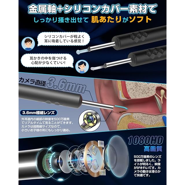 【2024年新機能新登場 カメラ付き耳かき】近年は耳かきが増えており、どれを選ぶべきか悩んでしまう方も多いのではないでしょうか。2024年弊社の最新機能耳かきが最新鋭アップグレード版として業界で登場しました!カメラ付き耳かきは伝統の耳掻きより耳の調子をはっきりと知っています。この耳かきカメラはWIFI発信機、ワイヤレス、カメラレンズを一体化にして、スマホとWIFIに繋がるだけで使用できます。恋人、親友、自分にプレゼントに最適です!✅✅【ダストキャップ付属】製品にはダストキャップが付属しており、細菌が製品から耳に入るのを防ぎます。