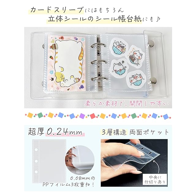■【A8サイズのミニバインダー(手のひらサイズ)セット内容】<br/> ❶カードポケットリフィル(3層構造/プラスチックシート)×20枚 ❷チャック付きボケット×2枚 ❸下敷き×2枚。※紙のリフィルは付属していません。※シールは別売りです。<br/> ■【手のひらサイズ】<br/> 内寸約6.8cm×9.2cmのカードスリーブで、一般的な各種トレカや写真をしっかり収納、バインダーに穴のないカードや写真を追加できます。本体サイズ(約):縦11.4㎝×横10.8㎝×厚み2.4㎝<br/> ■【便利な付属品】<br/> ❶カードスリーブにはもちろん、立体シールのシール帳台紙にも!シール帳台紙として、リフィルに集めたラールを貼ろう!<br/> ❷チャック付きのポケットには切ったシール、プリクラ、小さなはさみやピンセットなど手帳用の素材を収納便利。領収書·レシート等の保管でも活躍!<br/> ❸下敷き表面はザラザラしていて、シールがべったり付かずに、剥がしやすい!また、文字を書くときにガタガタせずペンの運びがスムーズ。<br/> ■【超厚・高透明・柔らか素材】<br/> 2枚の0.08mmのPPフィルム3枚重ねで、合計0.24㎜の厚さとなり、頑丈なリフィルに仕上がっております。厚みがあるのでシワになりにくいです。<br/> キーホルダー用の型穴あり、ペン先で抜いてね!3つのリング構造により、ページのめくり動作も快適!<br/> 中央に仕切りあり、柔らか素材で、開閉しやすい。適度な厚みでシワになりにくい。透明度が高いPP素材を原料としております。<br/> ■【3層構造(両面ポケット)】<br/> 両面カードポケットになっていますが、中央に仕切りがあるため、3層構造になっています。手帳の横幅を長くしたのでリフィル・ポケットがサイドからはみ出ない。<br/> ■【リングの開閉は、両端を軽く押すだけでOK】<br/> リフィルの追加や入れ替えもスムーズに行えます。いつでもあなた好みの手帳に!開け閉めしやすく、しっかりとまるスナップボタンを採用。カバンの中で勝手に開い