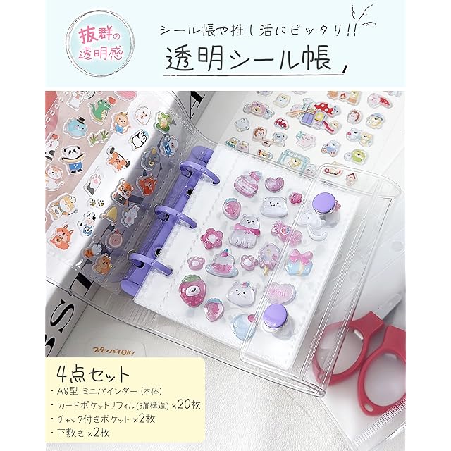 GOKEI シール帳 プラバン 透明 A8 ミニ バインダー 【リフィル×20枚 チャック付きボケット×2枚 下敷き×2枚】 PPシート カードポケット シール台紙 手帳 プリ帳 カードスリーブ 透明シール帳 はがせる バインダー型ノート 女の子 コラージュノート パープル