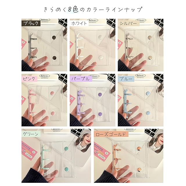 【リングの開閉は、両端を軽く押すだけでOK】 リフィルの追加や入れ替えもスムーズに行えます。いつでもあなた好みの手帳に!開け閉めしやすく、しっかりとまるスナップボタンを採用。カバンの中で勝手に開いてしまう心配もありません。シンプルな透明ボディは、あなたの個性を引き立てるキャンバス。チャームをつけたり、ステッカーを貼ったり。アイデア次第で無限に広がる、カスタマイズの楽しさを体験してください。またちょこっとした気の使われないプレゼントにも最適です。