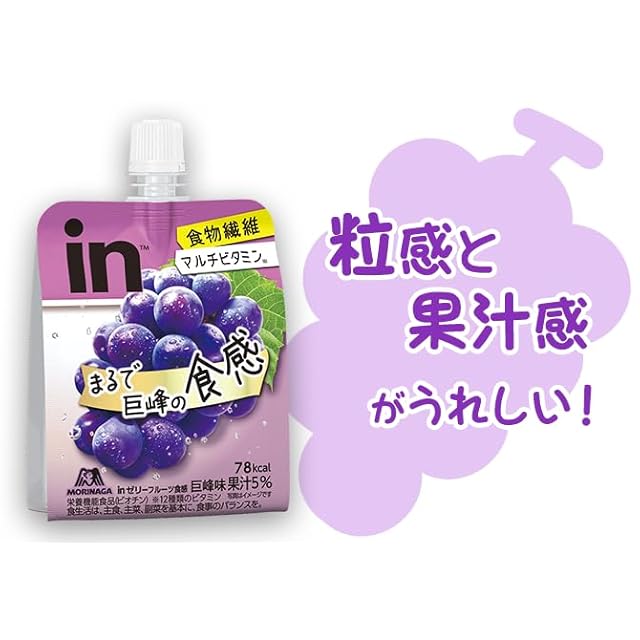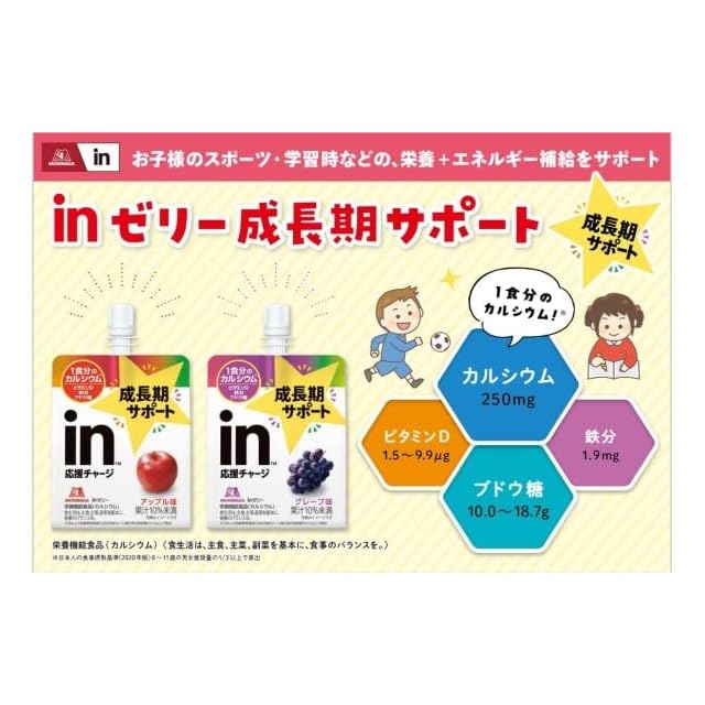 原材料名 【エネルギー】 液状デキストリン(国内製造)、果糖ぶどう糖液糖、マスカット果汁/酸味料、乳酸Ca、ゲル化剤(増粘多糖類)、V.C、香料、塩化K、乳化剤、パントテン酸Ca、ナイアシン、V.E、V.B1、V.B2、V.B6、V.A、葉酸、V.D、V.B12 【マルチビタミン】 果糖ぶどう糖液糖(国内製造)、グレープフルーツ果汁、砂糖/酸味料、香料、乳酸Ca、ゲル化剤(増粘多糖類)、V.C、塩化K、ナイアシン、パントテン酸Ca、乳化剤、V.E、V.B1、V.B2、V.A、V.B6、葉酸、ビオチン、V.D、V.B12 【マルチミネラル】 グレープ果汁、砂糖、水あめ/乳酸Ca、クエン酸、ゲル化剤(増粘多糖類)、硫酸Mg、香料、塩化K、甘味料(アセスルファムK、スクラロース)、グルコン酸亜鉛、ピロリン酸鉄、乳化剤、グルコン酸銅 【プロテイン】 ホエイペプチド(乳成分を含む)(アメリカ製造、国内製造)、ドライトマトエキス/安定剤(大豆多糖類)、酸味料、ゲル化剤(増粘多糖類)、乳酸Ca、香料、乳化剤、甘味料(スクラロース、ステビア、アセスルファムK)、グルタミン酸Na、アラニン、塩化K、酵素処理ルチン、パントテン酸Ca、葉酸、V.B6、V.B1、V.B2、V.B12 【マルチビタミンカロリーゼロ】 エリスリトール(中国製造)、パインアップル果汁、食塩/香料、酸味料、ゲル化剤(増粘多糖類)、乳酸Ca、V.C、塩化K、甘味料(スクラロース、アセスルファムK)、ナイアシン、パントテン酸Ca、V.E、乳化剤、V.B1、V.B2、V.A、V.B6、葉酸、ビオチン、V.D、V.B12 【エネルギーブドウ糖】 ぶどう糖(国内製造)、寒天/酸味料、香料、ゲル化剤(増粘多糖類)、乳酸Ca、塩化K、ナイアシン、パントテン酸Ca、甘味料(スクラロース、アセスルファムK)、乳化剤、V.B1、V.B2、V.A、V.B6、葉酸、V.D、V.B12 【フルーツ食感 もも】 砂糖(国内製造)、もも果汁、難消化性デキストリン、果糖ぶどう糖液糖、発酵乳(殺菌)、寒天/ゲル化剤(増粘多糖類)、香料、乳酸Ca、酸味料、V.C、甘味料(アセスルファムK、スクラロース)、ナイアシン、パントテン酸Ca、乳化剤、V.E、V.B1、V.B2、V.A、V.B6、葉酸、ビオチン、V.D、V.B12 【フルーツ食感 メロン】 砂糖(国内製造)、メロン果汁、難消化性デキストリン、果糖ぶどう糖液糖、発酵乳(殺菌)、ホエイたんぱく/ゲル化剤(増粘多糖類)、乳酸Ca、香料、酸味料、V.C、甘味料(アセスルファムK、スクラロース)、ナイアシン、パントテン酸Ca、乳化剤、V.E、V.B1、V.B2、V.A、V.B6、葉酸、ビオチン、V.D、V.B12 【成長期サポート <アップル】 砂糖(国内製造)、ぶどう糖、りんご果汁、水あめ、寒天、ドライトマトエキス/乳酸Ca、香料、酸味料、ゲル化剤(増粘多糖類)、塩化K、乳化剤、ピロリン酸鉄、V.D 【成長期サポート <グレープ】 砂糖(国内製造)、ぶどう糖、ぶどう果汁、水あめ、寒天、ドライトマトエキス/乳酸Ca、香料、酸味料、ゲル化剤(増粘多糖類)、塩化K、乳化剤、ピロリン酸鉄、V.D