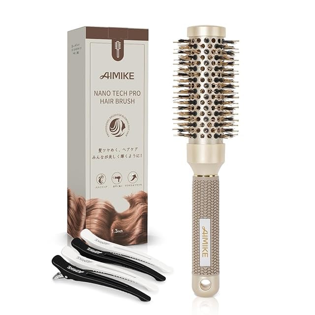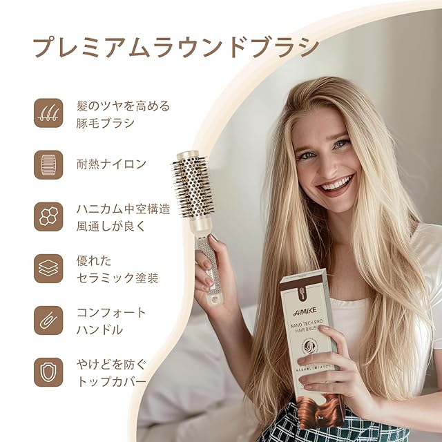 商品名:AIMIKE ミディアム ロールブラシ ブロー時間短縮 カールブラシ ストレート&カール用 ヘアブラシ ナノセラミックイオン技術 ラウンドブラシ ボリュームアップ ロールカールブラシ 豚毛+ナイロン ラウンドヘアブラシ 猪毛 耐熱 縮れを減らす サラツヤ(バレル直径3.2cm、総直径6cm)