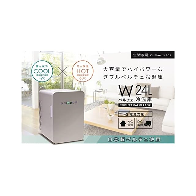 日本製ペルチェを2つ搭載した冷温庫。1度単位で設定できる保冷・保温の2つの機能搭載で夏はクールに冬はホットにご利用いただけます。スタイリッシュなデザインながら24リットルサイズの大容量サイズ。(収納目安:500mlペットボトルが24本。または2Lペットボトルが4本。ペットボトルの形状により収納本数は異なります)