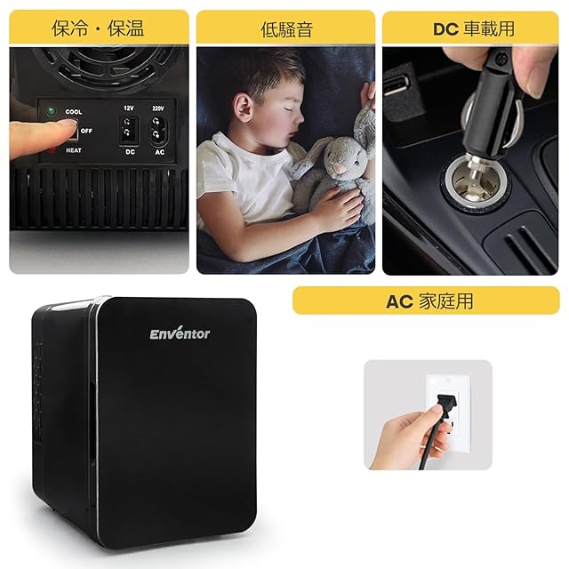 商品名:Enventor 冷温庫 4L 小型 保冷・保温用 ペルチェ式 ミニ冷蔵庫 省エネ 静音 AC/DC給電 ポータブル冷蔵庫 僅か 軽量 持ち運び便利 12V 車載用 車中泊 キャンプ アウトドア 職場 卓上 寝室 家庭用 (ブラック)