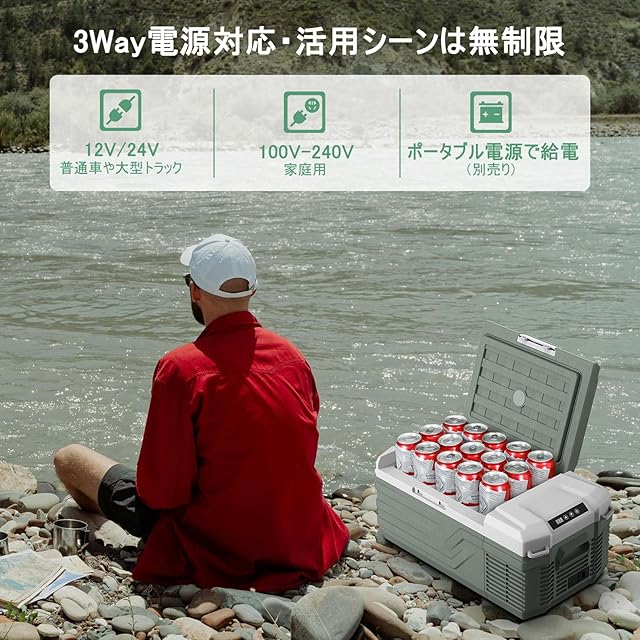 【場所を問わずに使いやすい】車のシガーソケットから給電できるDC電源(12V/24V)と、家庭用コンセントで使えるAC電源(100V-240V)のほか、ポータブル電源(別売り)対応可能で、電源がない場所でも使るポータブル 冷蔵庫です。飲食物を収納しやすいうえ、長時間使えて温度の管理がしやすいです。さらに、夏場でもキンキンに冷えた飲み物が飲める静かな車載用冷蔵庫です。