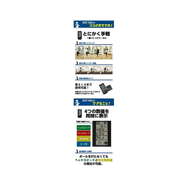 スルガオンラインでの累計販売台数は80,000台を突破!「ヘッドスピード」「ボールスピード」「推定飛距離」「ミート率」4つを1画面で同時表示。GST-3Gからの変更点は、表示範囲の拡大でアプローチの練習に対応。ヘッドスピード下限…15.0m/s→10.0m/s、ボールスピード下限…20.0m/s→15.0m/sに変更されました。スイング回数のカウントも可能になりました。これらパワーアップした点は上位機種にも搭載されている機能です。左利きにも対応!単4形アルカリ乾電池4本使用。コンペ景品、プレゼントにも最適!同系統のGST-5Wよりも安くおすすめです(バッテリーが充電式か電池式か、SDカードスロットがあるかないかの違いのみ)。