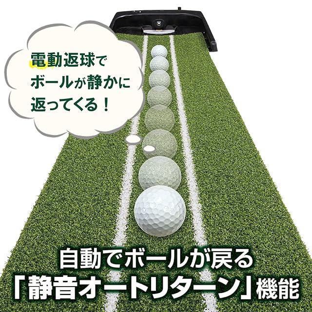 打ったボールがアドレス位置に自動で戻る「静音オートリターン」機能を採用した電動式パターマット。