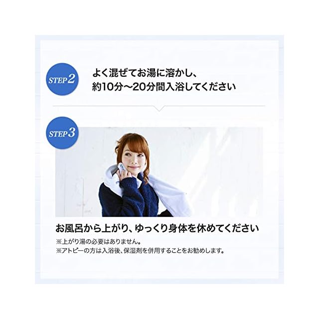 エプソムソルトの使い方は、150Lのお風呂に150cc以 上(0.1~0.2%)入れてください。数秒でお湯が白く濁 りまた透明にもどり水道水の塩素は中和されます。ゆっ くり温まってください。入浴時間20分をお勧めします。
