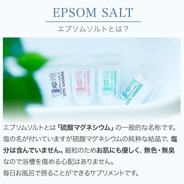 エプソムソルトの効果は? 水道の塩素を中和し、ミネラルの働きで皮膚の乾燥を防ぎ、水分、油分を補い保ち、肌を整えます。