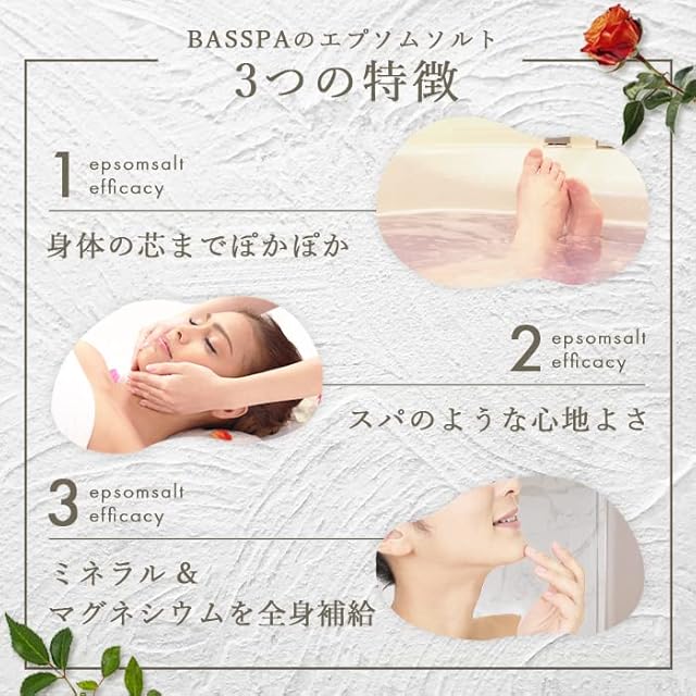 1.海のミネラルでリラックス。2.スパもような心地よさ。3.マグネシウム純度99%以上。
