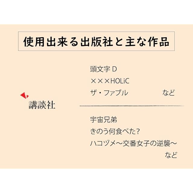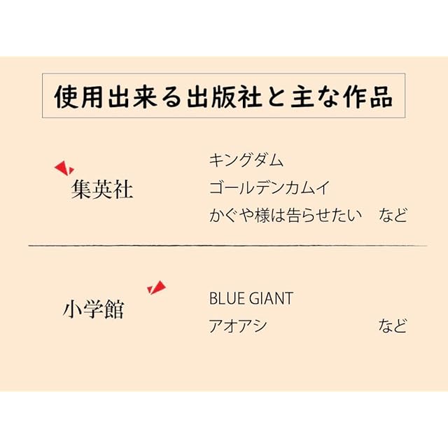 主に、ヤングジャンプ(集英社)・ビッグコミック(小学館)・ヤングマガジン(講談社)・モーニング(講談社)・(リイド社)・(徳間書店)・(竹書房)の青年コミックに適応しています。