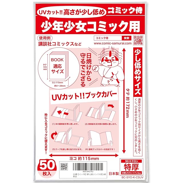 ■”コミック侍”ブランド 高さ低めの少年少女コミック(講談社コミックス)用のUVカットタイプの透明ブックカバーです<br>・OPPフィルムに特殊な加工を施すことで、紫外線を大幅にカットすることが可能です<br>・通常の少年コミック用サイズから高さを低くくし、小さめの少年コミックに対応しました<br>・115x172ミリの講談社コミックス(東京リベンジャーズ・七つの大罪など)に装着可能です<br>・コミック侍シリーズは徹底的にコストを見直し品質を磨いたオリジナルブックカバー<br>・パッケージに装着方法や本の適合サイズを分かりやすく表記<br>・限りなくクリアな透明度のOPPフィルムは、しわがつきにくく上品な光沢があり、本の表紙に耐水性と防汚性をプラスできます<br><br>■こんな場面にオススメです<br>・図書館やレンタルコミック店に<br>・インターネットカフェや飲食店に<br>・個人のコレクション用に<br>・美容院や待合室に 貸し借りの際の汚れ防止に<br><br>■対応書籍 横:115mm 縦:172mm前後 厚み:5~20mm程度の本に対応しています <br>【ぴったり】<br>・七つの大罪(少年マガジン/講談社)<br>・東京リベンジャーズ(少年マガジン/講談社) <br><br>※実際に装着して確認しておりますが、急な書籍のサイズ変更もあるため、サイズの適合をするものではございません。あくまでも参考値のため、実際はご自身の責任でお確かめ下さい。<br>※密着テープは接着後、2,3日ではがれにくくなります。粘着力が強いため、開封時に破れることがあります。
