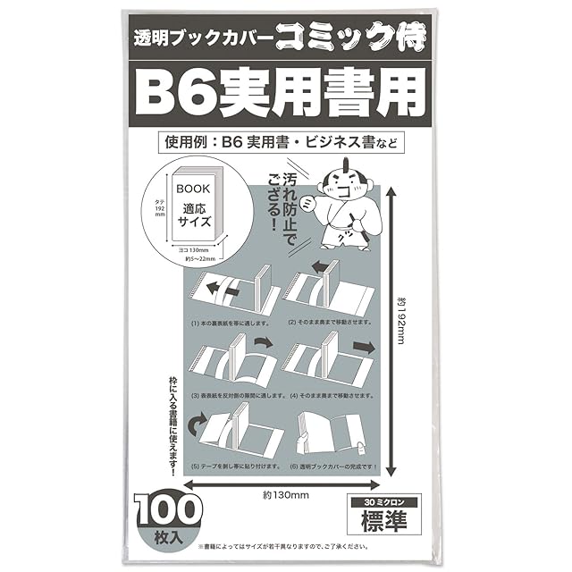 ■”コミック侍”ブランドのB6サイズの透明ブックカバーです。<br>・徹底的にコストを見直し品質を磨いたオリジナルブックカバー。<br>・パッケージに装着方法や本の適合サイズを分かりやすく表記。<br>・限りなくクリアな透明度のOPPフィルムは、しわがつきにくく上品な光沢があり、本の表紙に耐水性と防汚性をプラスできます。<br>・焼却してもダイオキシン等の有毒ガスが発生しない、環境に優しい素材です。<br><br>■こんな場面にオススメです<br>・図書館やレンタルコミック店に<br>・インターネットカフェや飲食店の業務用に<br>・個人のコレクション用に<br>・美容院や待合室に<br>・貸し借りの際の汚れ防止に<br><br>■対応書籍 横:130mm 縦:192mm前後 厚み:5~22mm程度のB6サイズの本に対応しています。 <br>【ぴったり】<br>・小宮式知的アウトプット術(すばる舎)・人を助けるすんごい仕組み(ダイヤモンド社)<br>・すいすい簿記マンガ(ネットスクール出版) <br><br>【タテ4mm程余裕あり】<br>・カオスノート(イースト・プレス)<br>・食べるならどっち!?(サンクチュアリ出版)<br>・百人一首(野ばら社) <br><br>【タテ5mm程余裕あり】<br>・足摺り水族館(1月と7月)<br>・白川静さんに学ぶ 漢字は楽しい(共同通信社)<br>・最新国語表記ハンドブック(大修館書館)<br>・白石範孝の国語授業の技術(東洋館出版) <br><br>【タテ6mm程余裕あり】<br>・白川静 文字学入門 なるほど漢字物語(共同通信社)<br>・人間仮免許(イースト・プレス) <br><br>※実際に装着して確認しておりますが、急な書籍のサイズ変更もあるため、サイズの適合をするものではございません。あくまでも参考値のため、実際はご自身の責任でお確かめ下さい。<br>※密着テープは接着後、2,3日ではがれにくくなります。粘着力が強いため、開封時に破れることがあります。