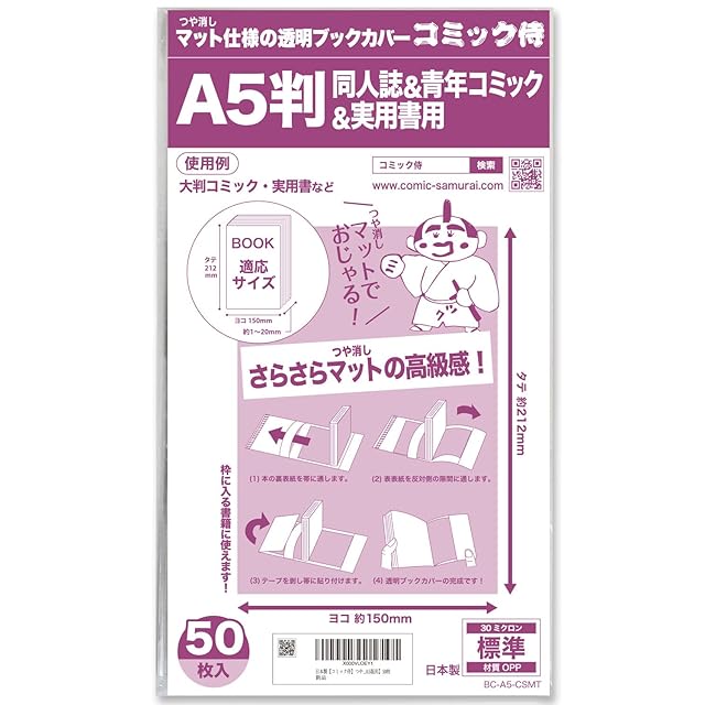 ■”コミック侍”ブランドのA5の実用書・同人誌などに使えるつや消しマット仕様の透明ブックカバーです。<br>・徹底的にコストを見直し品質を磨いたオリジナルブックカバー。<br>・パッケージに装着方法や本の適合サイズを分かりやすく表記。<br>・つや消しマットは光を反射しにくく、本の表紙をなめらかに美しくみせます。<br>・マット加工が施された透明ブックカバーは、手触りがさらさらで高級感を演出できるのが特徴です。<br>・焼却してもダイオキシン等の有毒ガスが発生しない、環境に優しい素材です。<br><br>■こんな場面にオススメです<br>・図書館やレンタルコミック店に<br>・インターネットカフェや飲食店の業務用に<br>・個人のコレクション用に<br>・美容院や待合室に<br>・貸し借りの際の汚れ防止に<br><br>■対応書籍 横:150mm 縦:212mm前後 厚み:1~20mm程度の本に対応しています <br>【ぴったり】<br>・未確認で進行形(4コマKINGパレットコミックス/一迅社)<br>・BUS GAMER(REXコミックス/一迅社)<br>・中学入試 国語読解問題なんかこわくない(受験研究者)<br>・2014 Vol.26 データブック オブ・ザ・ワールド(二宮書店)<br>・白泉社ジェットコミックス(白泉社)<br>・中高教科書 A5判 <br><br>【タテ2mm程余裕あり】<br>・ぷちます!(Dengeki Comics EX/角川書店)<br>・たりはプリキュア スプラッシュスター2プリキュアコレクション(ワイドKCFCなかよし/講談社)<br>・漢字検定 試験問題集(成美堂出版)<br>・ワイルドアダプター(チャラコミックススペシャル /徳間書店)<br>・徒と創る協同学習(明治図書) <br><br>【タテ3mm程余裕あり】<br>・うた恋い。(MFコミックスフラッパーシリーズ/メディアファクトリー)<br>・ゆるゆり(YURIHIMEコミックス/一迅社)<br>・ヘタリア(バーズエクストラアシックスパワーズ/幻冬舎)<br>・むし師 特別編 日蝕む翳(アフタヌーンKCデラックス/講談社)<br>・きょうの思春期(イブニングKCデラックス/講談社)<br>・ふらり。(モーニングKCデラックス/講談社)<br>・じょしらく(ワイドKCマガジン/講談社)<br>・40代からの太らない体のつくり方(三笠書房)<br>・花のズボラ飯(エレガンスイブ/秋田書店)<br>・ごくせん(ユーコミックス/集英社)<br>・チャンネルはそのまま!(ビッグスピリッツコミックススペシャル/小学館)<br>・しろくまカフェ(フラワーコミックススペシャル/小学館)<br>・マンガで分かる心療内科(YKコミックス/少年画報社)<br>・うさぎドロップ(祥伝社)<br>・ささくさの咲く頃(太田出版)<br>・国語科クイズ100(東洋館出版社)<br>・MOTEL(にちぶんコミックス/日文文芸社) <br><br>【タテ4mm程余裕あり】<br>・一騎当千(GUM COMICS/ワニブックス)<br>・最遊記外伝(ゼロサムコミックスA5版/一迅社)<br>・大阪・神戸周辺自転車散歩(山と渓谷社)<br>・不安の種(ACWチャンピオン/秋田書店)<br>・ママはテンパリスト(集英社)<br>・ゾンビチャン(サンデーGXコミックススペシャル/小学館)<br>・百姓貴族(新書館) <br><br>※実際に装着して確認しておりますが、急な書籍のサイズ変更もあるため、サイズの適合をするものではございません。あくまでも参考値のため、実際はご自身の責任でお確かめ下さい。<br>※密着テープは接着後、2,3日ではがれにくくなります。粘着力が強いため、開封時に破れることがあります。