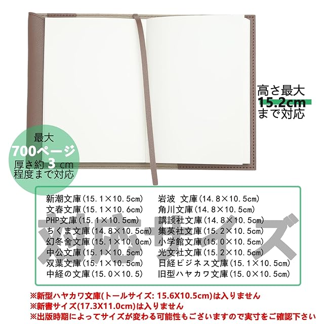 【対応サイズ】A6判・文庫判、長さ↾:148~152mm 幅⇁:105~115mm 調節できる折り畳むデザインなのでページ数に合わせて厚さ:1~3cmまでの文庫本、ラノベ、コミック文庫などもビッタリ使えます.ブックカバー だけでなく、A6サイズの手帳カバー、スケジュール帳カバー、ほぼ日手帳カバー(サイズはご確認ください)として もご利用いただけます。