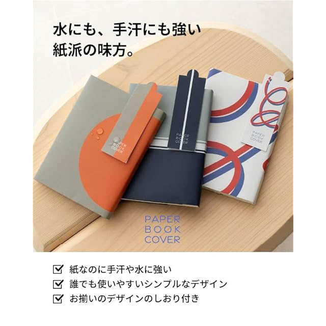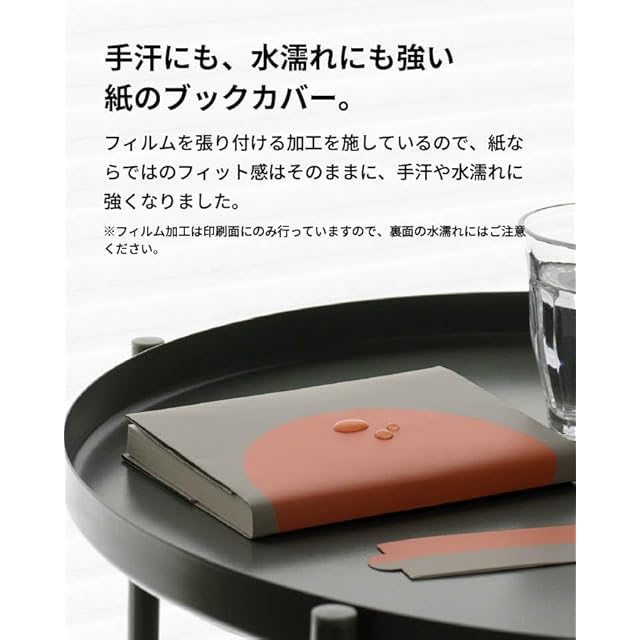 手汗にも、水濡れにも強い、紙のブックカバー。フィルムを張り付ける加工を施しているので、紙ならではのフィット感はそのままに、手汗や水濡れに強くなりました。※フィルム加工は印刷面にのみ行っていますので、裏面の水濡れにはご注意ください。
