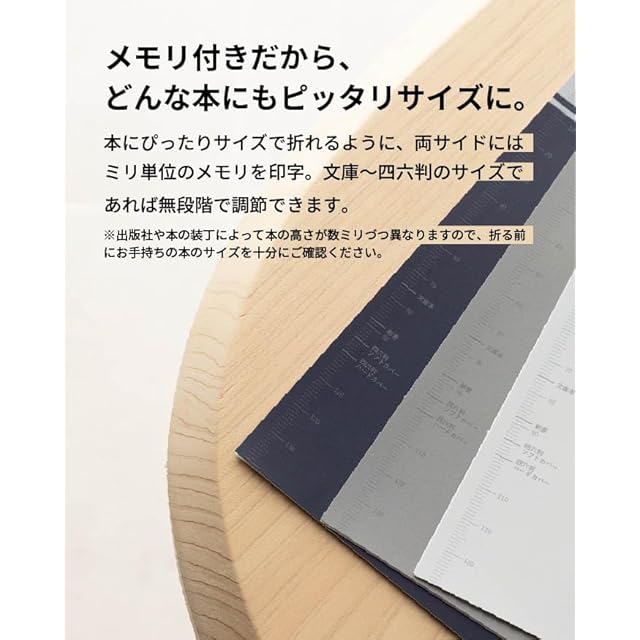 メモリ付きだから、どんな本もぴったりサイズに。本にぴったりサイズで折れるように、両サイドにはミリ単位のメモリを印字。文庫~四六判のサイズであれば無段階で調節できます。※出版社や本の装丁によって本の高さが数ミリずつ異なりますので、折る前にお手持ちの本のサイズを十分にご確認ください。