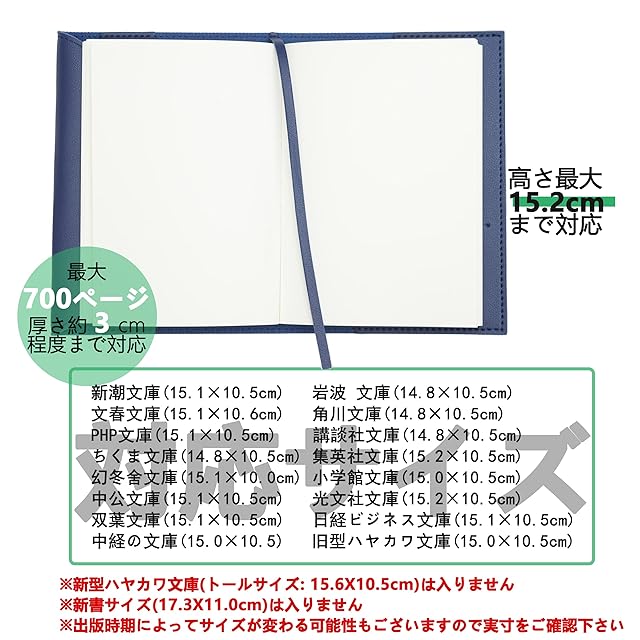 【対応サイズ】A6判・文庫判、長さ↾:148~152mm 幅⇁:105~115mm 調節できる折り畳むデザインなのでページ数に合わせて厚さ:1~3cmまでの文庫本、ライトノベル、コミック文庫などもビッタリ使えます.ブックカバーだけでなく、A6サイズの手帳カバー、スケジュール帳カバー、ほぼ日手帳カバー(サイズはご確認ください)として もご利用いただけます。