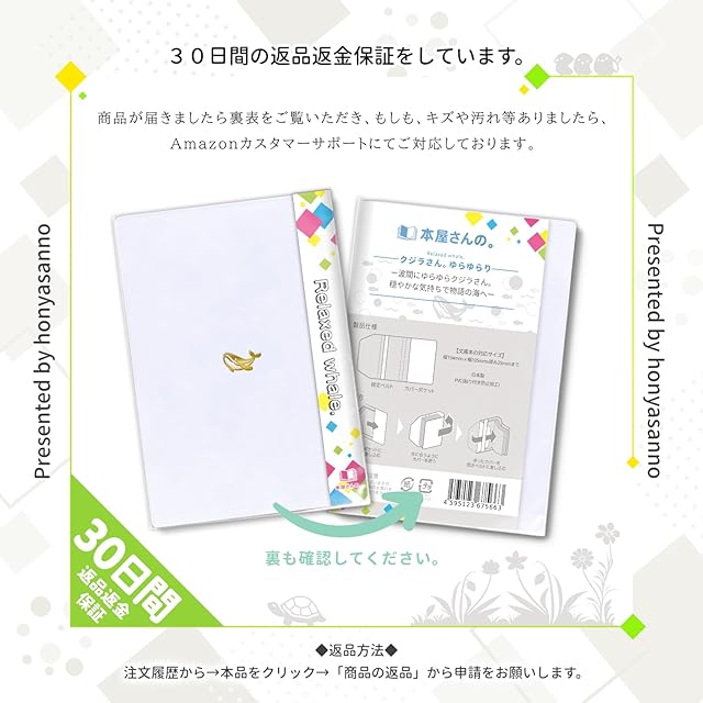 「本屋さんの。」ブランドから登場した、文庫本サイズのブックカバーは、縦154mm×幅105mm×厚み25mmまでの文庫本に対応しています。カバーには高耐久PVC素材を使用し、裏面には貼り付き防止加工を施しています。防水性があり、大切な本を水、キズ、汚れから守ります。可愛いワンポイントデザインにホッコリする小さなストーリーも楽しめます。また、手帳カバーやノートカバー、スケジュール帳カバーとしても使用可能です。商品には30日間の返品返金が付いており、日本語でのサポートで提供しています。読書をより快適に楽しむためのブックカバーです。ぜひお試しください。