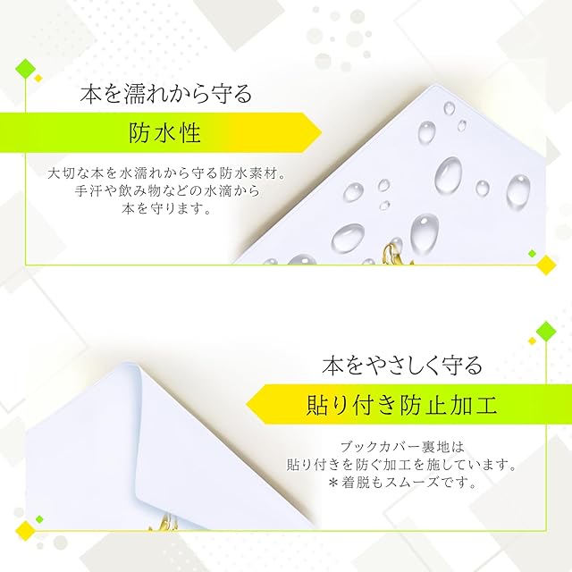 【ブックカバーの効果2】防水性があります。大切な本を水、キズ、汚れから守ります。*ただし、側面などのカバーの掛からない部分への水濡れは防げません。ご注意ください。