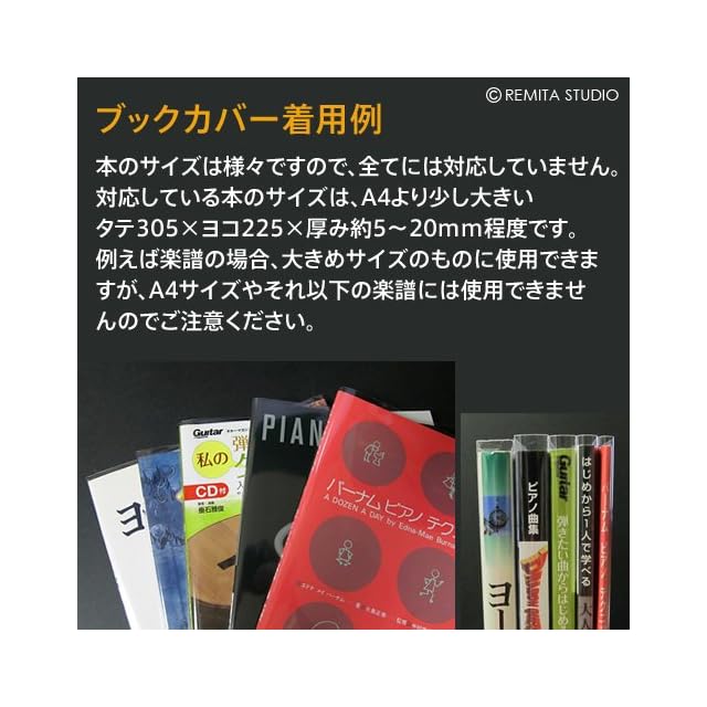 ◆A4強サイズの本(例:楽譜・美術書など)に使用できる透明ブックカバー 15枚入り <br> 【ご注意】A4より少し大きい本に使用できます。大きいサイズの楽譜や美術書、写真集など。A4と同じサイズのものやそれ以下のサイズには使えません。 <br> ※楽譜や美術書などは様々なサイズがあるので対応サイズを確認してからご購入ください。 <br> 【着用例】全訳ハノンピアノ教本、バーナムピアノテクニック、はじめから1人で学べる 大人のためのピアノレッスン、ブルクミュラー25の練習曲、パデレフスキ編 ショパン全集、ピアノ曲集 ドラゴンクエスト、これからはじめる!! アコースティックギター入門 <br> ※洋書扱いの楽譜、輸入盤サイズなど高さが31cm以上の特殊なサイズは入りません。例:ヘンレ社原典版(高さ31.6cm) <br> ◆対応サイズ:タテ305mm×ヨコ225mm×厚み約5~20mm程度に対応 <br> ◆カバーサイズ:570mm×308mm 静電防止加工テープ <br> ◆OPP素材 40ミクロン/OPP素材とは薄い透明フィルムのような素材です。 <br> ◆日本製 <br> <br> ◆注意 <br> ・カバーサイズの各2%までを誤差、口ズレの許容範囲としています。 <br>