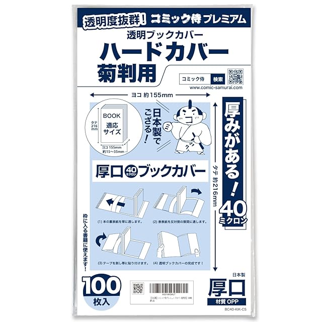 【日本製】コミック侍プレミアム 厚口40ミクロン 透明ブックカバー【ハードカバー菊判用】100枚