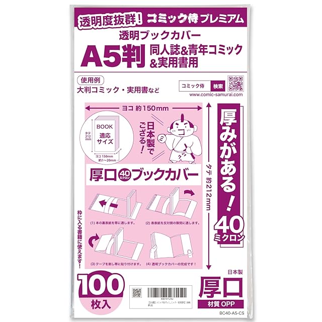 ■”コミック侍”ブランドのA5判同人誌・青年コミック・実用書用の40ミクロンプレミアム仕様の透明ブックカバーです。<br>・フィルムの厚みは厚口の40ミクロンタイプで、標準タイプよりもコシがあり高級感を感じる厚みです。<br>・徹底的にコストを見直し品質を磨いたオリジナルブックカバー。・パッケージに装着方法や本の適合サイズを分かりやすく表記。<br>・限りなくクリアな透明度のOPPフィルムは、しわがつきにくく上品な光沢があり、本の表紙に耐水性と防汚性をプラスできます。・焼却してもダイオキシン等の有毒ガスが発生しない、環境に優しい素材です。 ■こんな場面にオススメです・図書館やレンタルコミック店に・インターネットカフェや飲食店の業務用に・個人のコレクション用に・美容院や待合室に・貸し借りの際の汚れ防止に ■対応書籍 横:150mm 縦:212mm前後 厚み:1~20mm程度の本に対応しています<br>【ぴったり】<br>・サクッとうかる日商簿記3級過去問ナビ(ネットスクール出版)<br>・ほぼ日手帳カズン(ほぼ日刊イトイ新聞)・未確認で進行形(4コマKINGパレットコミックス/一迅社)・BUSGAMER(REXコミックス/一迅社)・中学入試国語読解問題なんかこわくない(受験研究者)<br>・2014Vol.26データブックオブ・ザ・ワールド(二宮書店)・白泉社ジェットコミックス(白泉社)・中高教科書A5判<br><br>【タテ2mm程余裕あり】<br>・ぷちます!(Dengeki ComicsEX/角川書店)・ふたりはプリキュアスプラッシュスター2プリキュアコレクション(ワイドKCFCなかよし/講談社)・漢字検定試験問題集(成美堂出版)・ワイルドアダプター(チャラコミックススペシャル /徳間書店)・徒と創る協同学習(明治図書)<br><br>【タテ3mm程余裕あり】<br>・うた恋い。(MFコミックスフラッパーシリーズ/メディアファクトリー)・ゆるゆり(YURIHIMEコミックス/一迅社)<br>・ヘタリア(バーズエクストラアシックスパワーズ/幻冬舎)・きょうの思春期(イブニングKCデラックス/講談社)<br>・ふらり。(モーニングKCデラックス/講談社)・じょしらく(ワイドKCマガジン/講談社)・40代からの太らない体のつくり方(三笠書房)・花のズボラ飯(エレガンスイブ/秋田書店)<br>・ごくせん(ユーコミックス/集英社)・チャンネルはそのまま!(ビッグスピリッツコミックススペシャル/小学館)・しろくまカフェ(フラワーコミックススペシャル/小学館)<br>・マンガで分かる心療内科(YKコミックス/少年画報社)・うさぎドロップ(祥伝社) <br><br>【タテ4mm程余裕あり】<br>・一騎当千(GUMCOMICS/ワニブックス)・最遊記外伝(ゼロサムコミックスA5版/一迅社)・大阪・神戸周辺自転車散歩(山と渓谷社)<br>・不安の種(ACWチャンピオン/秋田書店)・ママはテンパリスト(集英社)・ゾンビチャン(サンデーGXコミックススペシャル/小学館)<br><br>※実際に装着して確認しておりますが、急な書籍のサイズ変更もあるため、サイズの適合をするものではございません。あくまでも参考値のため、実際はご自身の責任でお確かめ下さい。<br>※密着テープは接着後、2,3日ではがれにくくなります。粘着力が強いため、開封時に破れることがあります。
