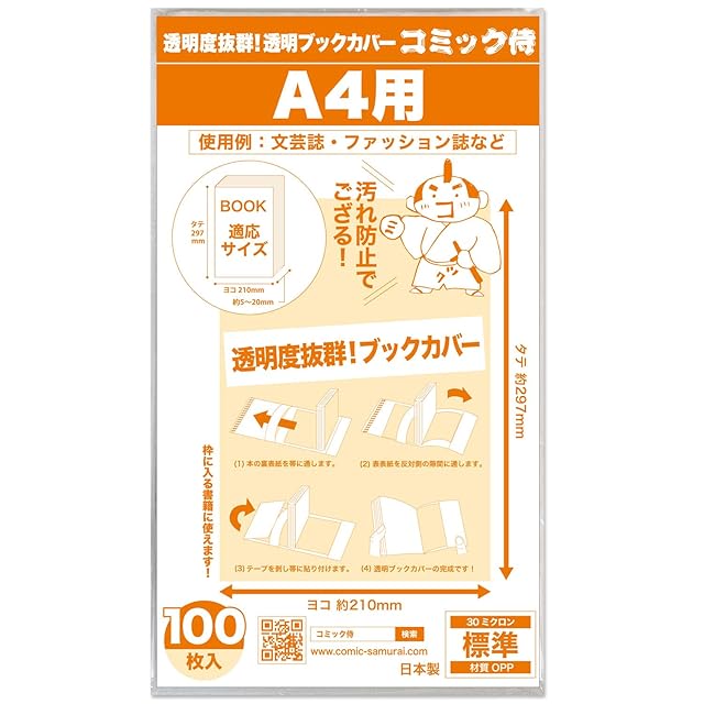 ■”コミック侍”ブランドのA4文芸誌・ファッション誌用透明ブックカバーです。<br>・透明度が非常に高いクリアカバーです。大切なA4判の文芸誌やファンション誌を美しく保護します。<br>・徹底的にコストを見直し品質を磨いたオリジナルブックカバー。<br>・パッケージに装着方法や本の適合サイズを分かりやすく表記。<br>・限りなくクリアな透明度のOPPフィルムは、しわがつきにくく上品な光沢があり、本の表紙に耐水性と防汚性をプラスできます。<br>・焼却してもダイオキシン等の有毒ガスが発生しない、環境に優しい素材です。<br><br>■こんな場面にオススメです<br>・図書館やレンタルコミック店に<br>・インターネットカフェや飲食店に<br>・個人のコレクション用に<br>・美容院や待合室に<br><br>■対応書籍 横:210mm 縦:297mm前後 厚み:5~20mm程度のA4文芸誌やファッション誌に対応しています。・Smart(宝島社)<br>・関西ウォーカー(KADOKAWA)<br>・FINE BOYS(日之出出版)<br>・Goods Press(徳間書店)<br>・ダ・ヴィンチ(KADOKAWA)<br><br>※実際に装着して確認しておりますが、急な書籍のサイズ変更もあるため、サイズの適合をするものではございません。あくまでも参考値のため、実際はご自身の責任でお確かめ下さい。<br>※密着テープは接着後、2,3日ではがれにくくなります。粘着力が強いため、開封時に破れることがあります。