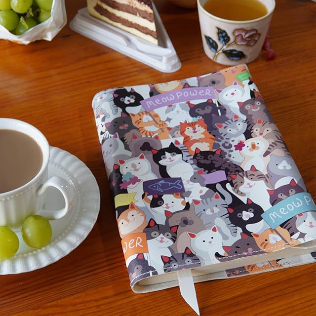 商品名:gogesブックカバー a5 防水レザー 可愛い ― 上質感のある合皮の高級本カバー(文芸書 参考書 専門書) サイズ調整可能 厚め対応可 しおり付き 軽量 おしゃれ(a5 猫柄プリント)
