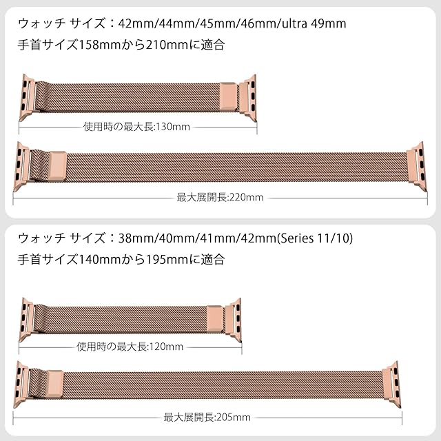 【全機種対応】コンパチブル Series Ultra3/Ultra2/Ultra/SE3/SE2/SE/11/10/9/8/6/5/4/3/2/1 シリーズに対応可能。49mm/46mm/45mm/44mm/42mm/41mm/40mm/38mm のサイズに対応できます。42mm(Series 11 10)/41mm/40mm/38mmは手首周り140mm~195mmに適しています。49mm/46mm/45mm/44mm/42mm(Series 3 2 1)は手首周り158mm~210mmに適しています。※購入前にサイズをご確認ください。