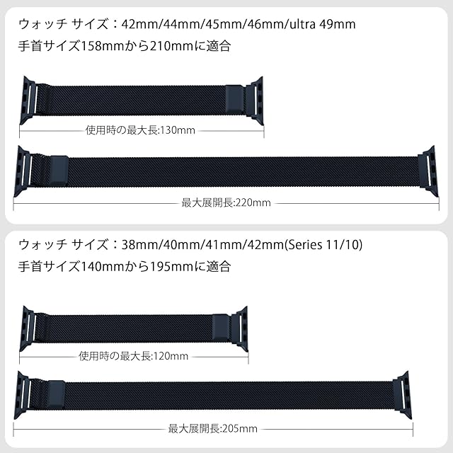 【全機種対応】コンパチブル Series Ultra3/Ultra2/Ultra/SE3/SE2/SE/11/10/9/8/6/5/4/3/2/1 シリーズに対応可能。49mm/46mm/45mm/44mm/42mm/41mm/40mm/38mm のサイズに対応できます。42mm(Series 11 10)/41mm/40mm/38mmは手首周り140mm~195mmに適しています。49mm/46mm/45mm/44mm/42mm(Series 3 2 1)は手首周り158mm~210mmに適しています。※購入前にサイズをご確認ください。