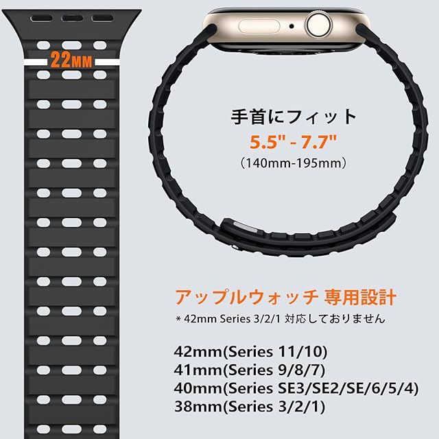 【対応機種】 コンパチブルアップルウォッチ用の SE3/SE2/SE/Series11/10/9/8/7/6/5/4/3/2/1に対応可能。38mm/40mm/41mm/42mm(Series11/10)のサイズに対応しています。手首サイズは140mm-195mmの方に適します。※本製品はバンドのみです、本体は含まれません。