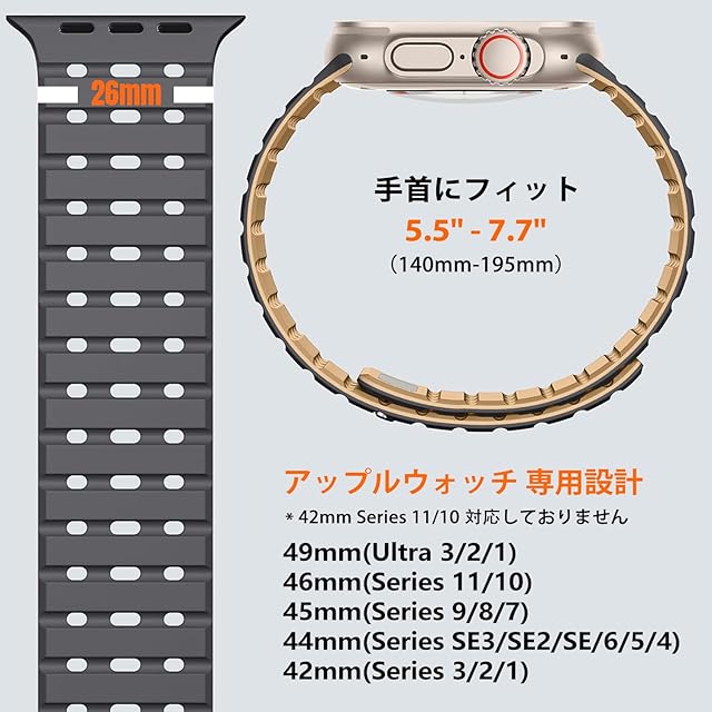 【対応機種】 コンパチブルアップルウォッチ用の Ultra3/Ultra2/Ultra Series SE3/SE2/SE/11/10/9/8/6/5/4/3/2/1に対応可能。49mm/46mm/45mm/44mm/42mmのサイズに対応しています。手首サイズは140mm-215mmの方に適します。※本製品はバンドのみです、本体は含まれません。