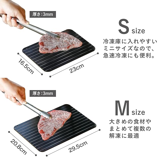 凍った食材をプレートに乗せるだけで簡単に解凍できる「atomico(アトミコ)解凍プレート」熱伝導率の高いアルミ素材で、食材の冷気を吸収・放熱することで素早く解凍!