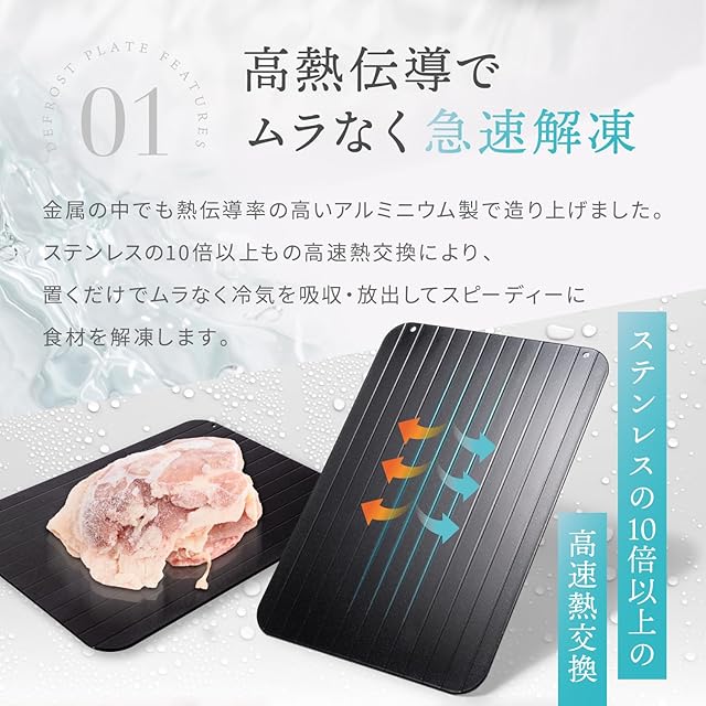 ✅【高純度アルミニウム製 】ステンレスの10倍以上という、熱伝導率が高いアルミニウムを採用しております。放熱性に優れ、高速熱交換を実現できます。自然解凍に比べ、最大9倍の速さで解凍できます。