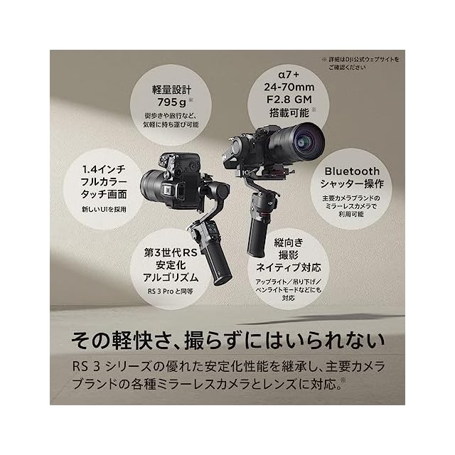 DJI RS 3 Mini 3軸ジンバル軽量スタビライザー ビデオカメラサポート(Canon/Sony/Panasonic/Nikon/Fujifilm向け) ジンバルカメラ 積載量(試験値)2 kg Bluetoothシャッター制御 縦向き撮影ネイティブ対応