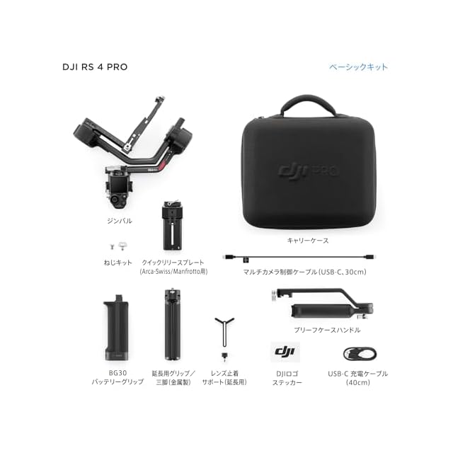 ✅DJI RS 4 Proには、ジンバル、BG30バッテリーグリップ、クイックリリースプレートなどが同梱されています。