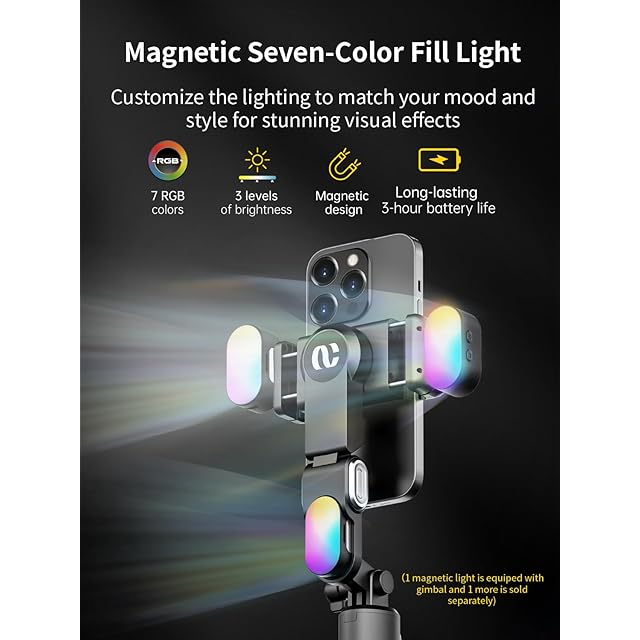 ポータブルな輝きを体験: 当社のフェイス トラッキング ジンバルは、3 つのマグネット式取り付け可能な補助ライトと同時に使用でき、柔軟な前面および背面の照明オプションを提供します。明るさ設定を調整できるので、好みに合わせて照明をカスタマイズし、撮影時の雰囲気をコントロールできます。マグネット式補助ライトをジンバルに簡単に取り付けて、低照度の難しい状況でも、完璧に照らされた写真やビデオを撮影できます。外出先で創造性を輝かせましょう