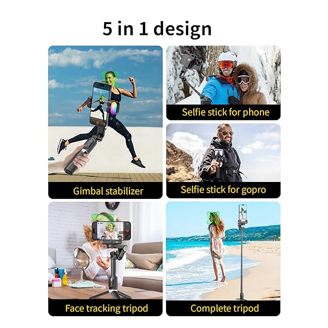多用途の4-in-1デザイン: 革新的な4-in-1デザインで、ジンバルスタビライザー、伸縮可能な自撮り棒、デスクトップスタンド、三脚機能を兼ね備えています。このオールインワンデザインは、さまざまな撮影ニーズを満たし、プロ品質のビデオや写真を撮影するための無限の可能性を提供します。ユーザーフレンドリーなコントロールでモードを簡単に切り替えることができます。当社のフェイストラッキングジンバルは、あなたのクリエイティブなビジョンに適応し、あらゆるシナリオに必要な柔軟性を提供します