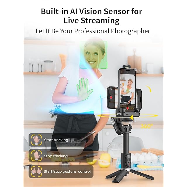AIビジョンセンサー:M1 Proのスマートフォンジンバルには、被写体を自動的に識別して追跡できるAIセンサーが内蔵されており、アプリをダウンロードしたりインストールしたりする必要がなく、被写体がどのように動いても、完璧にフレームに収まり、焦点が合った状態を保つことができます。手動調整に別れを告げ、楽な撮影を始めましょう。TikTokやYouTubeの動画を撮影する場合でも、この機能を使用すると魅力的なコンテンツを作成できます