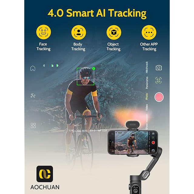 【実用的で便利なアプリ】AOCHUANアプリは、iPhoneとAndroidの両方のスマートフォンに対応する簡単でユーザーフレンドリーなインターフェースを提供します(折りたたみスクリーンは利用できません)。 顔の追跡、ボディトラッキングオブジェクトトラッキング、その他のアプリトラッキングなどのジェスチャーコントロールとAIトラッキングを提供します。パノラマ、広角、ライブブロードキャスト、タイムラプス、モーションディレイなどのさまざまな撮影モードにより、クリエイティブなビジョンを簡単に実現できます。